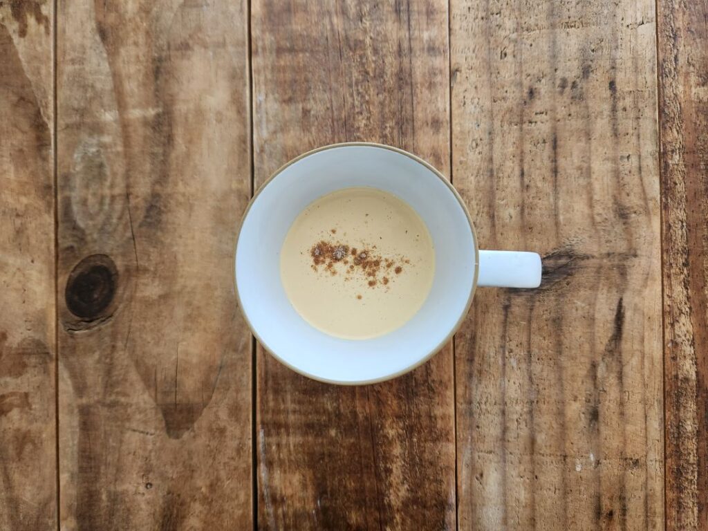 ④ カップに注ぎ、ナツメグパウダーをふりかけたら完成。