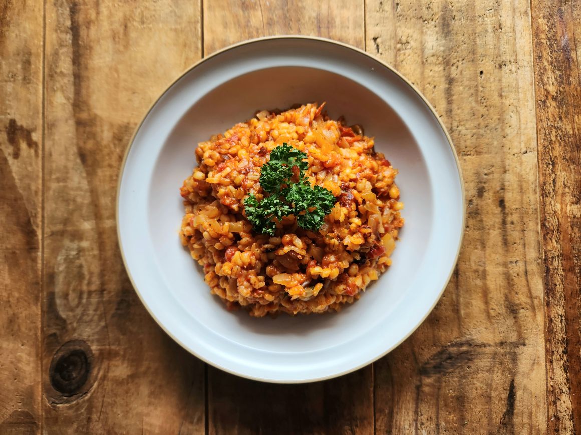 ③ 洗った米を②に加えてよく混ぜる。野菜ブロスを注ぎ、沸騰したら弱火にしてふたをし、20〜25分くらい炊く。
