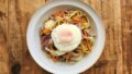② 鍋に水を入れ、粗みじん切りのタマネギ、薄切りニンジンを火が通るまで煮る。そこに柵のままのマグロを加え、弱火で2分くらい煮て(煮過ぎないように)身をほぐす。