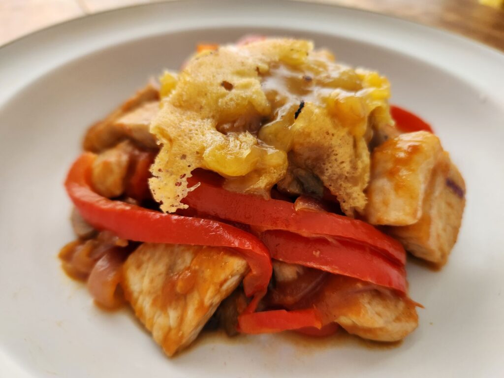 ② 同じフライパンに、スライスしたタマネギとマッシュルーム、細切りの赤パプリカ、粗みじん切りしたトマトを加え、野菜がしんなりするまで炒める。水、{塩+コンソメ}を合わせたもの、パプリカパウダー、黒こしょうを加えてよく混ぜ、①の肉を加えて弱火で10分くらい煮込む。