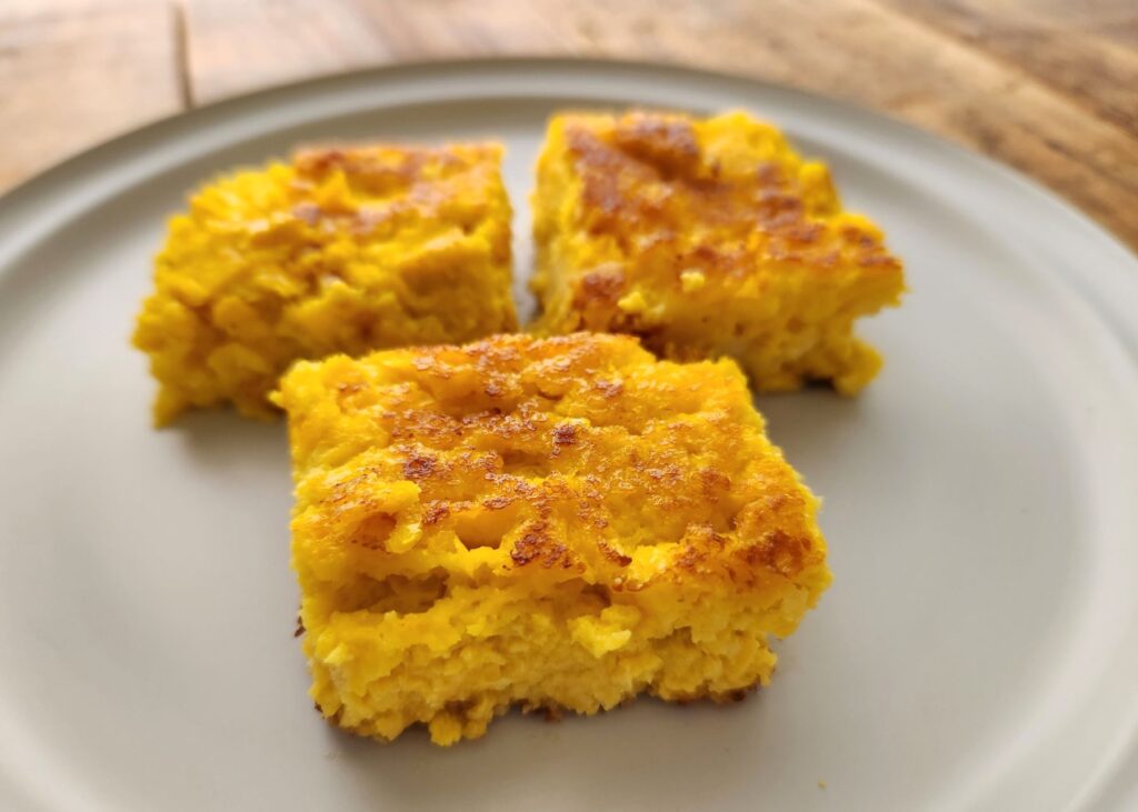 ② 耐熱皿に①を流し込み、表面を平らにする。オーブンで中火で40分くらい、または油をひいた鍋に入れて中弱火で20~25分くらい、表面が固まって軽く色づくまで焼く。冷めたら切り分けて完成。