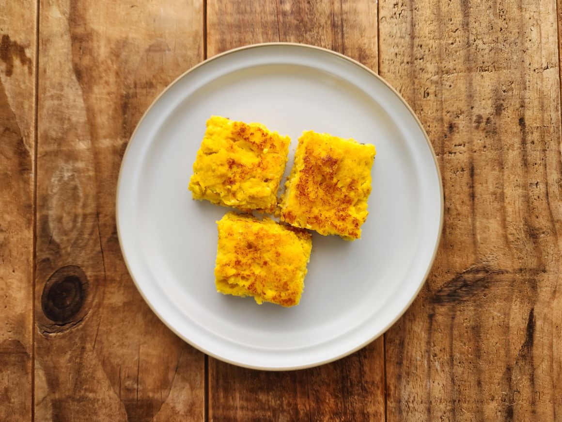 ② 耐熱皿に①を流し込み、表面を平らにする。オーブンで中火で40分くらい、または油をひいた鍋に入れて中弱火で20~25分くらい、表面が固まって軽く色づくまで焼く。冷めたら切り分けて完成。