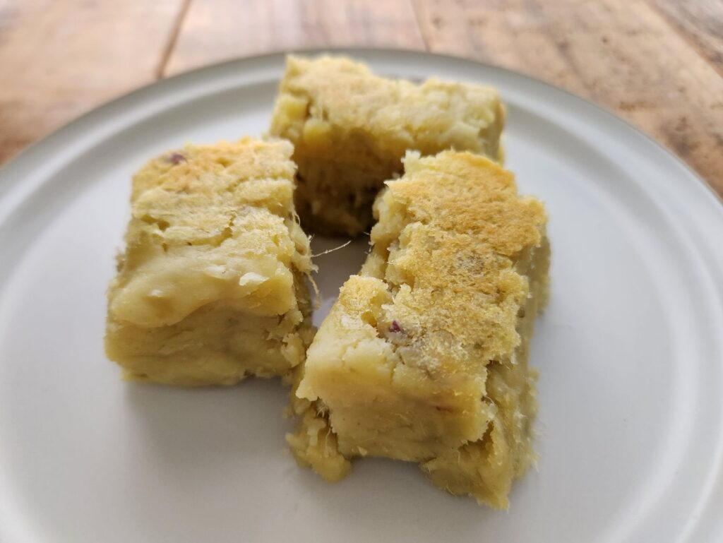 キャッサバ・プディングは、キャッサバとココナッツミルクを練って蒸した伝統料理。