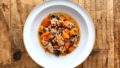 ② 鍋に短冊切りしたベーコン、小さめに角切りしたジャガイモ、野菜ブイヨンを入れて火にかけ、ジャガイモが柔らかくなり始めたら、①のマカロニを加える。